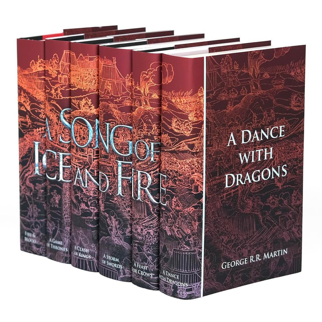 This curated collection includes six hardcover books published by Bantam, featuring the five novels in the main series plus the prequel, Fire & Blood. Our design studio crafted custom jackets that unfold into an epic medieval battle scene, styled like a classic engraving with a dramatic red-to-black gradient. It’s a display-worthy masterpiece that transforms your shelves into a tribute to the epic saga.