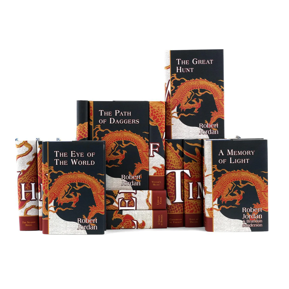 Our meticulously designed covers for the fourteen books and the prequel novel are perfect for ambitious fans of high fantasy. Robert Jordan’s wife, editor Harriet McDougal, and co-author Brandon Sanderson worked with us closely on the design. The covers pay homage to the Dragon Banner, set against a backdrop representing The Flame of Tar Valon and the Dragon’s Fang – opposing elements that illustrate the themes of balance and the cyclical nature of time in the series.
